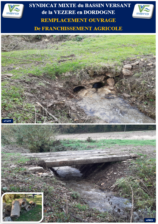 L’action de remplacement d’ouvrages de franchissement consiste à remplacer un ouvrage existant, le plus souvent busés, par un ouvrage à fond naturel de type passerelle ou dalot.